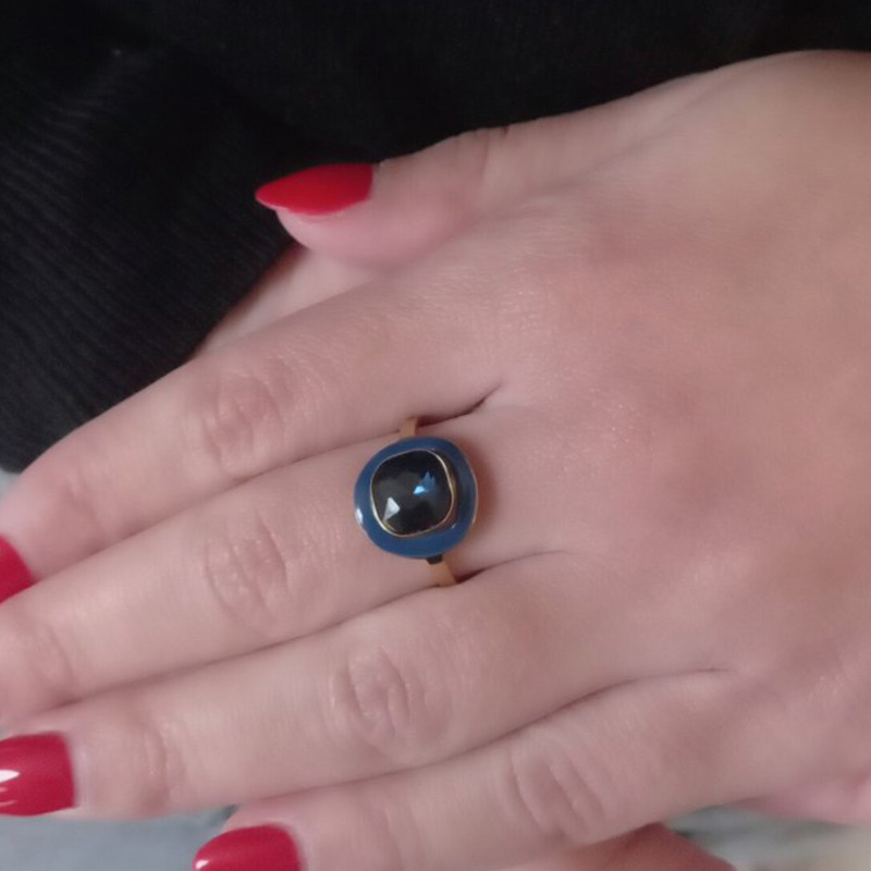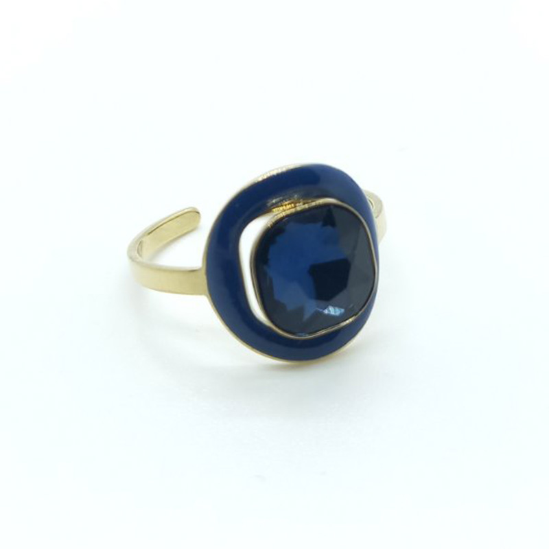 Δαχτυλίδι ατσάλινο χρυσού χρώματος, διακοσμημένο στο κέντρο του με κρύσταλλο μπλε χρώματος, διαμέτρου 1 cm και θερμού μπλε σμάλτου στο περίγραμμά του. Προσαρμόζεται στο μέγεθος του δακτύλου.